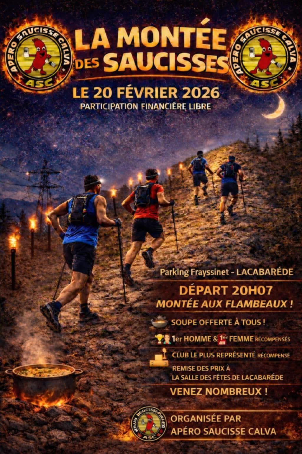 Départ à 20h07, montée aux flambeaux. Soupe offerte à tous.