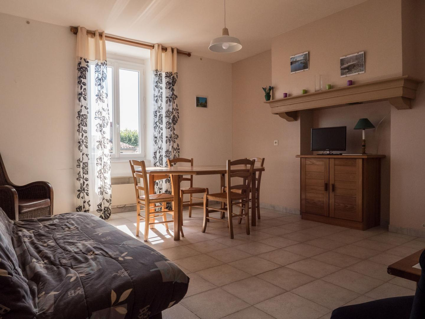 Au rez-de-chaussée : cuisine indépendante toute équipée, salon (table, canapé convertible, tv), wc.