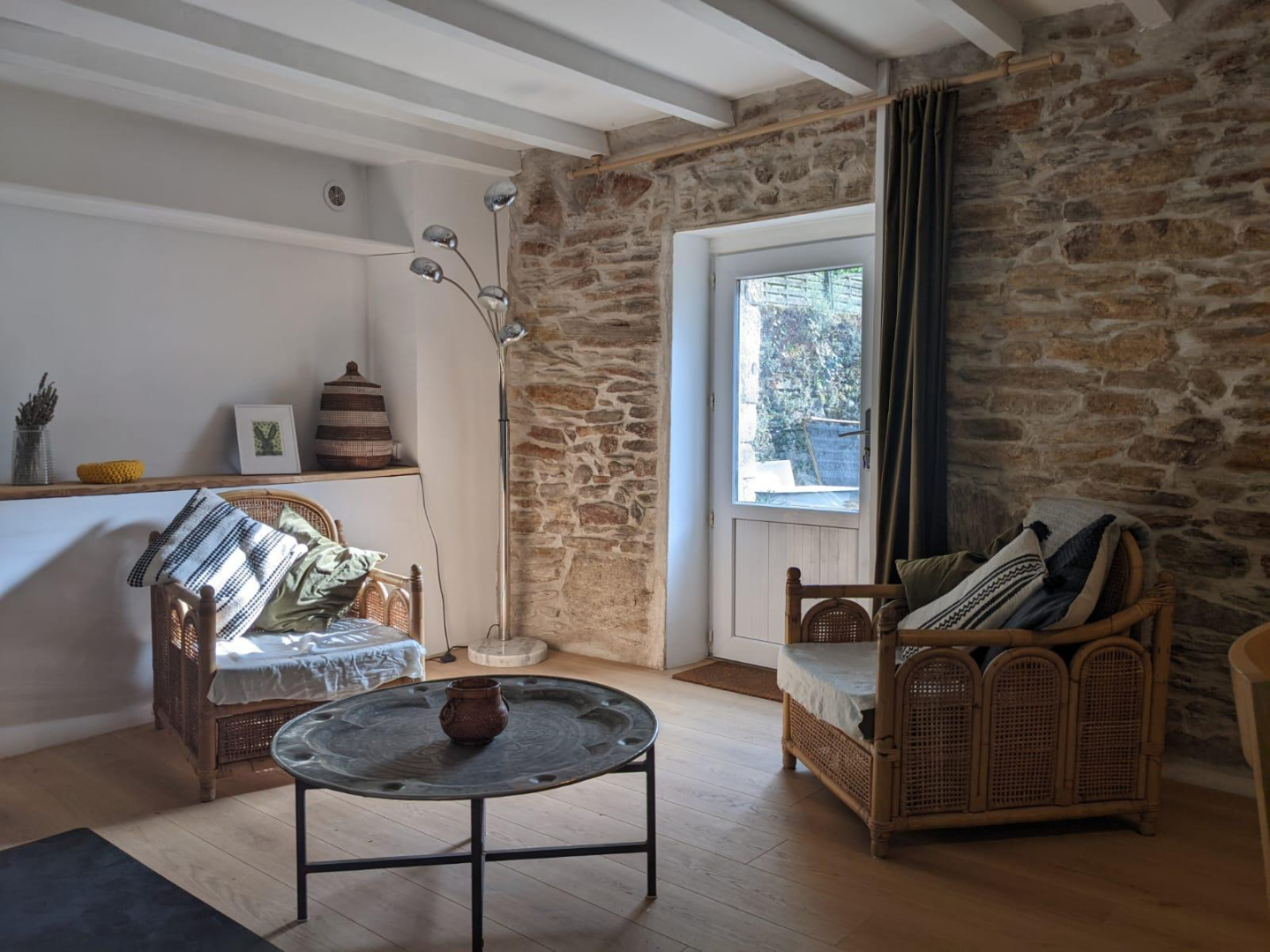 A l’entrée, le salon est équipé d’une cuisine ouverte et d’une petite terrasse abritée.
